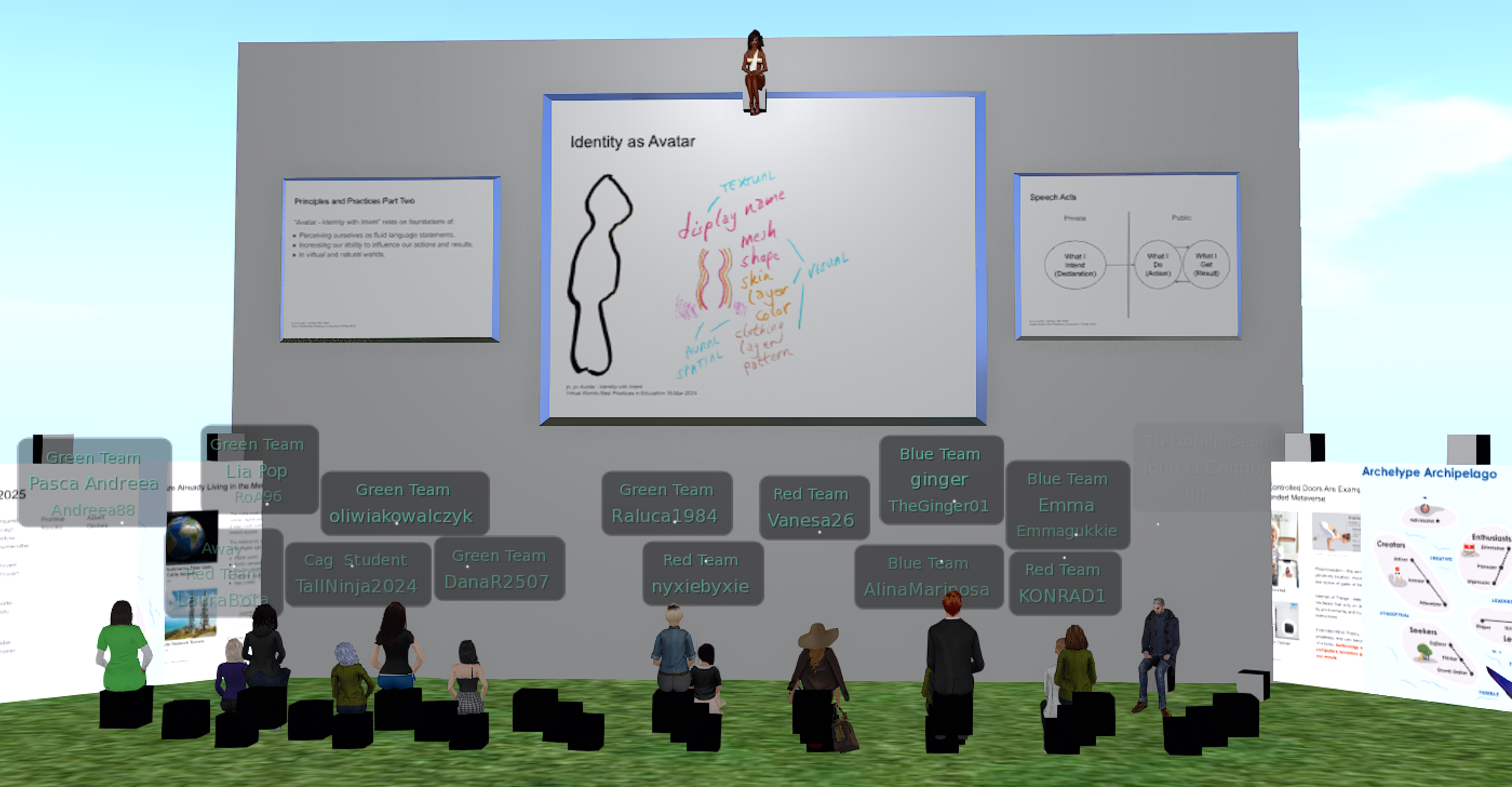 Then we had a look at the brief for the Student Challenge in a little detail to determine precisely what is expected. The detail is in the previous post Serious Simulations in the Metaverse. Some changes have been made to the teams for the Student Challenge which will be confirmed next week but, in the meantime the teams broke out with their instructors to confirm the team lead and assistant lead and share contact details. Both Red and Green teams met but nobody from the Blue team was in class so the members will need to catch up on that work in their own time.