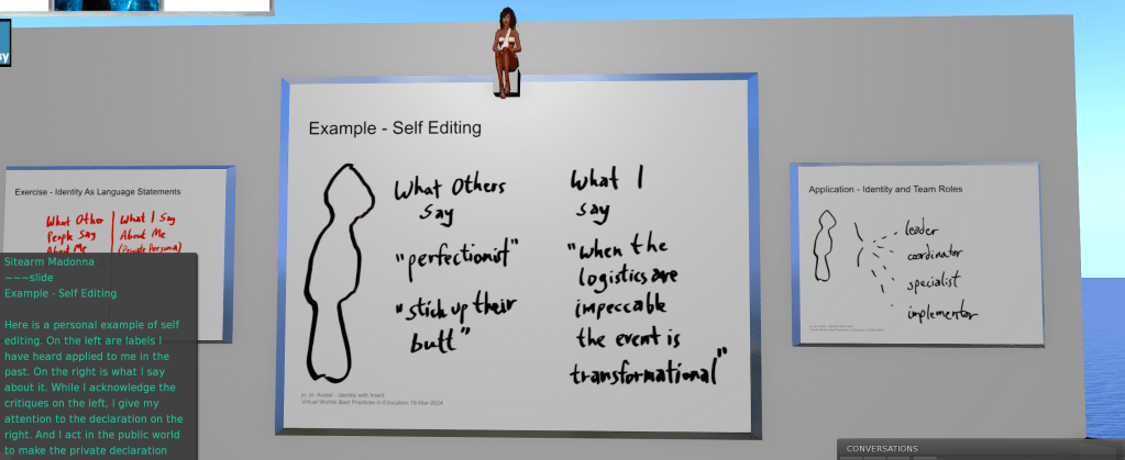 Sitearm and Tae spoke about taking control of our identities in today’s class. Tae gave the background to some of the current thinking around what the ‘self’ might be and how it is formed. This led on to the concept of our ‘personas’ and how this forms our identity. This subject is a little easier to consider in the context of our use of avatars in Second Life.
