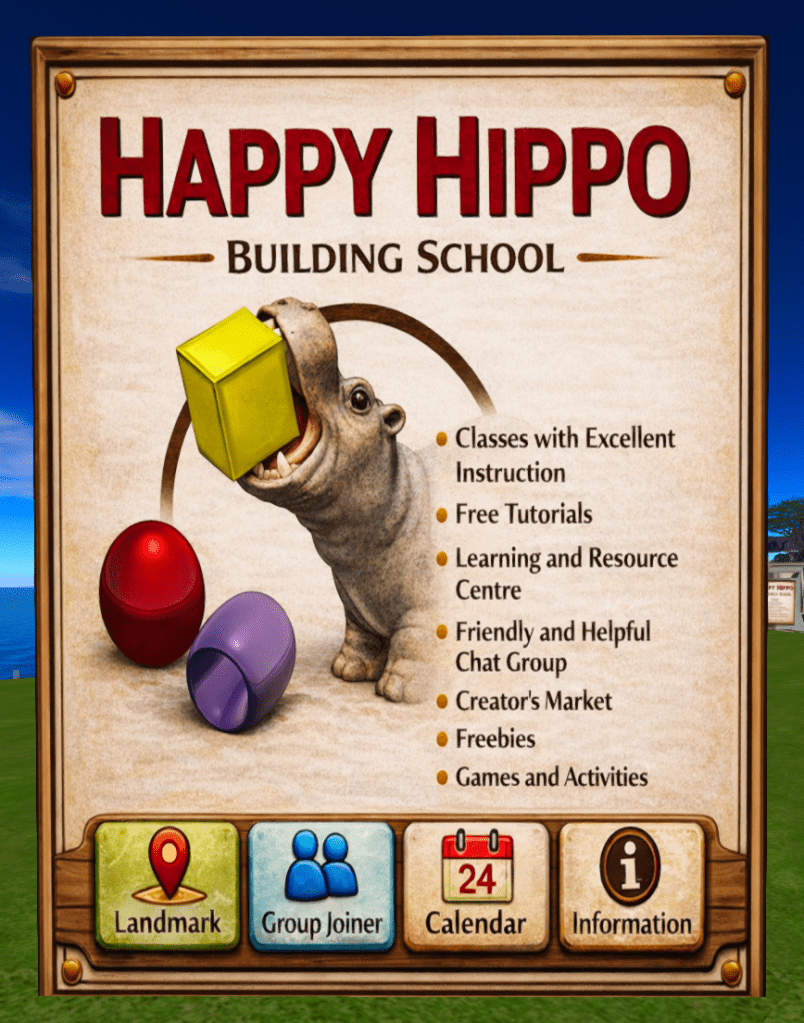 This was followed by a visit to the Happy Hippo Building School with Leslea Aldrin and JeZeBeLe Dagger. The school is a tremendous resource for anyone building in Second Life. It offers regular building classes at all levels and specialising in a range of topics from scripting to adding media. Many classes can be taken at your own convenience and are available all the time. The school is well worth visiting to see the huge range of support available. Here is the Landmark for the school in Second Life.