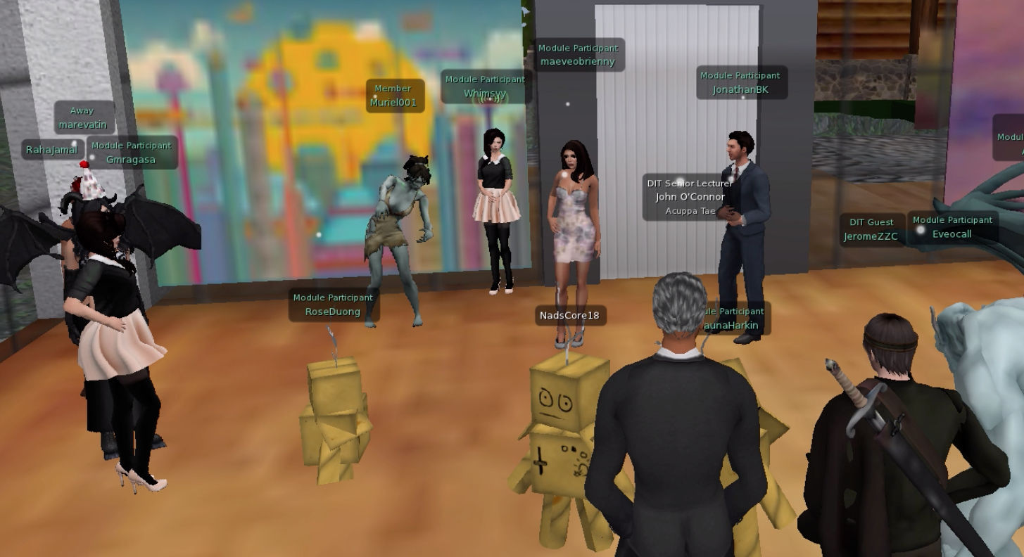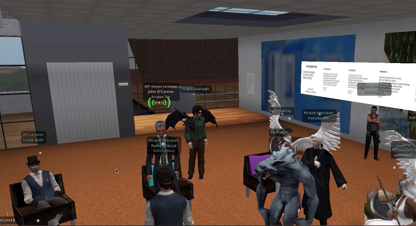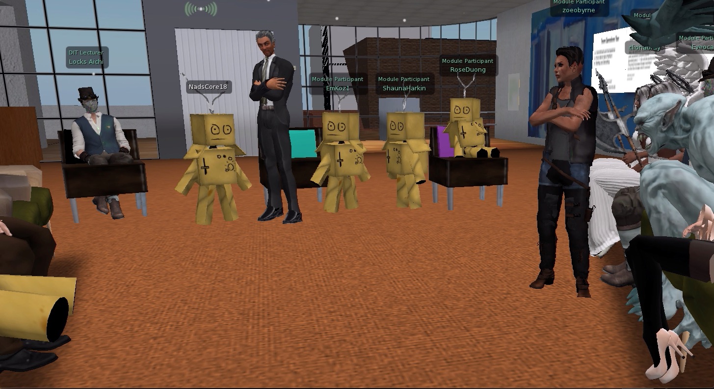 Locks Aichi joined the class for the presentations by each team this week. A variety of approaches was taken including YouTube videos, Google Slide show to illustrate presentations in the classroom and finally, a visit to another location in SL which did not turn out as expected. The group gave us a link to a shopping centre to open their talk with a demonstration. Unfortunately, the owner was online when all thirty of us teleported there simultaneously and she assumed it was a griefing attack! After some serious confusion and much swearing on her part we returned to DIT. An explanation was sent to the shopkeeper by IM and the incident was concluded without any further rancour. It provided an excellent learning opportunity for the final meeting of our group – always ask permission before visiting someone else’s virtual space with a group – much as you would in Real Life. To be fair to the student team it had visited the location during the week and found it deserted and quite reasonably expected the same for our visit.