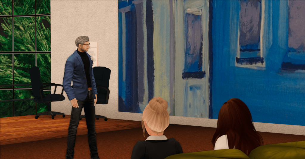 We had the field trip to Virtual Ability Island (VAI) this week where we were welcomed by Gentle Heron who outlined the history and raison d’être for the community. Following this we broke out into five groups, each one led by a member of the VAI team, for an opportunity to have a discussion about the functioning of the community. The small groups made it easier for the students to ask questions and learn a little more about the members of VAI, why they joined, and what they get from being members.