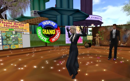 Lissena told us that Inspiration Island is the home of a programme called Whole Brain Health. Their purpose is to improve the quality of people’s lives through Interactive, Innovative, Inspiring activities and programmes. The intention is to support participants in positive personal development—both in-world and outworld. The programmes are based on a scientifically-sound, holistic approach to well-being—nurturing body, mind and spirit. There are currently about forty avatar-volunteers of all ages building facilities such as a 3D Maze, an Art and Music Park, a Covid-19 Information Centre created by a member who is a medical librarian. They facilitate programmes like Muscle Relaxation, Relationships in SL and Beyond, Drum Circle, The Wisdomseekers and Hero Walk. Lissena gave us globe teleporters that contained a menu of over thirty different places to visit. The place where we had the class, called Sunvibes, was built by Szavanna who lives in South Africa after emigrating from Hungary over twenty years ago. She is a DJ here and finds little-known world music from Africa, India, the Middle East among others, for dancing every Tuesday at noon SLT. The social interaction as people use dance animations, dance at home and chat in text is a fun experience with several benefits.